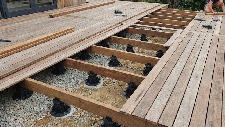 La plage périphérique en lames de bois exotique (ipé, cumaru) ou composite apporte une finition haut de gamme. Découvrez notre guide de pose pour terrasse bois sur plots pour réaliser votre plage de piscine.